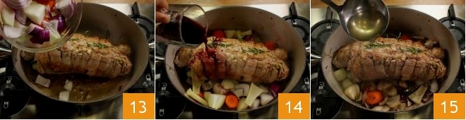 Ajoutez les légumes coupés grossièrement 13, puis arrosez la viande avec le vin rouge 14 et faites évaporer. Ensuite, versez une paire de louches de bouillon de légumes 15 et couvrez avec le couvercle. Faites cuire le roulé pendant environ 1 heure et demie à feu très doux, en continuant à verser du bouillon de légumes de temps en temps et à retourner le rôti pour une cuisson uniforme.