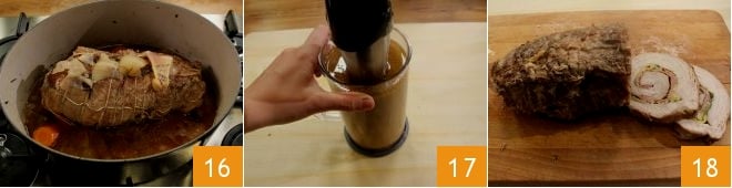 Une fois cuit, éteignez le feu et retirez la viande, placez-la sur une planche à découper pour la laisser refroidir. Versez le fond de cuisson et les légumes dans un récipient haut et mixez le tout avec un mixeur plongeant pour obtenir une petite crème 17 : ce sera la sauce avec laquelle vous pourrez accompagner la viande. Tranchez la viande 18 et nappez-la de sauce avant de servir !