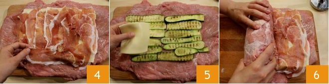 Disposez les tranches de jambon, les courgettes grillées et les tranches de fontina 5 (vous pouvez aussi commencer par les courgettes, l'important est que la fontina soit entre les deux couches d'ingrédients), puis roulez la viande sur elle-même en partant d'un des côtés les plus courts 6.