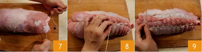 Comment ficeler le rôti avec de la ficelle de cuisine de cette manière : passez la ficelle d'abord sous puis au-dessus de la viande, dans le sens de la longueur, en fixant bien les extrémités du fil 7 et en laissant une partie de la ficelle légèrement plus longue. Avec la partie de ficelle plus longue, repassez par le côté opposé, passez votre main dans la boucle et tournez la corde deux fois, puis faites passer la viande dans la boucle obtenue. Fixez bien la base du nœud en serrant l'anneau créé autour de la viande et en tirant légèrement sur la ficelle vers le haut pour serrer le nœud. Complétez la "cage" en répétant cette opération jusqu'à terminer la ficelage sur toute la longueur de la viande (8-9).
