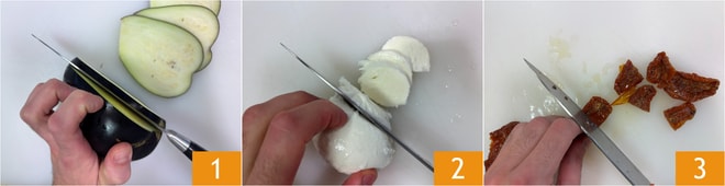 Pour préparer les aubergines à la pizzaiola, commencez par couper les aubergines en tranches d'environ 1 cm d'épaisseur 1. Coupez également la mozzarella 2 et la scamorza en tranches. Coupez en deux les tomates séchées 3.