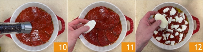 Salez et poivrez 10. À ce stade, parsemez la mozzarella sur toute la surface 11, puis ajoutez les tranches de scamorza 12.