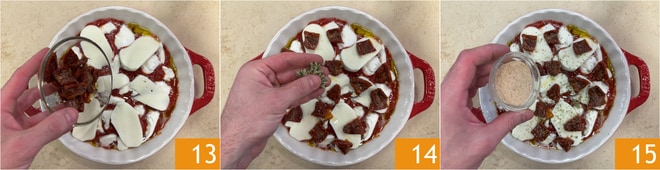 Complétez avec les tomates séchées 13 et l'origan séché 14. Enfin, saupoudrez de chapelure 15.