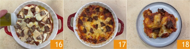 Arrosez d'un filet d'huile 16 et faites cuire dans un four statique à 200°C pendant 20 minutes, jusqu'à ce que le fromage soit fondu et la surface bien dorée 17. Vos aubergines à la pizzaiola sont prêtes à être servies 18 !
