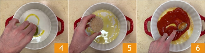 Dans un plat à gratin de 28 cm de diamètre, versez un filet d'huile au fond 4 et saupoudrez toute la surface de chapelure 5. Ajoutez environ 100 g de purée de tomates et essayez de la répartir sur toute la base à l'aide du dos d'une cuillère 6.
