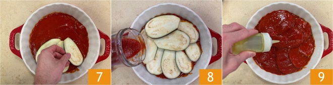 Disposez les tranches d'aubergines dans le plat en les superposant légèrement 7, puis couvrez avec le reste de purée de tomates 8. Assurez-vous que toutes les aubergines soient bien recouvertes de purée, y compris les côtés. Assaisonnez avec de l'huile 9.