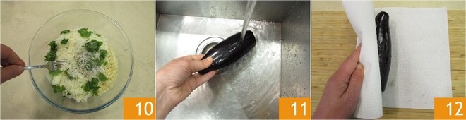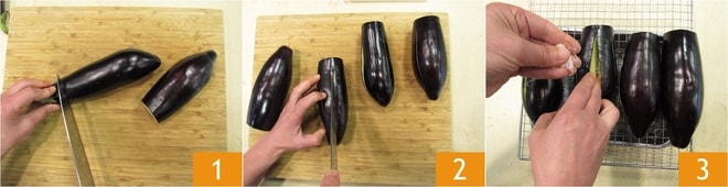 Pour préparer les aubergines 'mbuttunate, commencez par laver les aubergines et enlever le pédoncule 1. Incisez les aubergines dans le sens de la longueur 2 en faisant attention à ne pas couper la base. 5-6 incisions suffiront pour des aubergines d'environ 200 g chacune. Dans les incisions, il faudra insérer une pincée de gros sel 3.