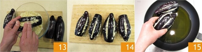 Il ne reste plus qu'à remplir les aubergines dans les incisions 13 14. Dans une poêle très grande (elles doivent toutes y tenir), versez l'huile de tournesol, chauffez-la une minute, puis mettez délicatement les aubergines sans vous brûler 15.