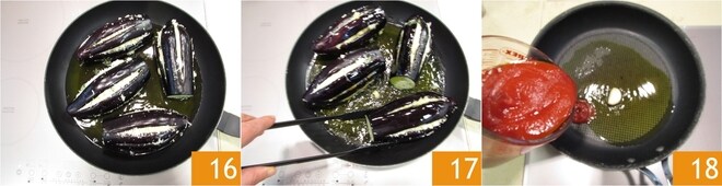 Faites-les cuire à feu moyen 16, en les retournant souvent 17 pendant environ 10 minutes. Pendant ce temps, préparez la sauce. Dans une poêle toujours assez grande, versez l'huile et une gousse d'ail entière non pelée. Faites infuser. Maintenant, ajoutez la sauce tomate 18.