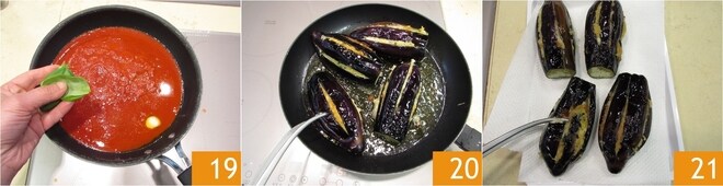 Assaisonnez de sel, ajoutez les feuilles de basilic 19 et laissez cuire pendant environ 10 minutes. Après 10 minutes, égouttez les aubergines 20 et transférez-les sur du papier absorbant 21.