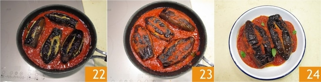 Transférez les aubergines dans la sauce 22. Faites cuire pendant environ 25-30 minutes, en les retournant délicatement au moins 2-3 fois. Une fois cuites 23, servez-les bien chaudes 24.