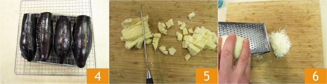 Laissez égoutter sur une grille, avec un récipient en dessous, pendant environ 2-3 heures 4. Pendant ce temps, préparez la farce. Coupez la mie de pain en cubes 5 et râpez le caciocavallo 6, le pecorino et le parmesan.