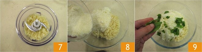 Mixez la mie de pain dans un mixeur 7 et transférez-la dans un bol. Ajoutez les fromages 8, les feuilles de menthe et de basilic 9.