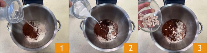 Pour préparer la babka au chocolat, commencez par verser dans le batteur la farine, le cacao amer, l'eau 1, le lait 2, puis ajoutez également la levure émiettée 3.