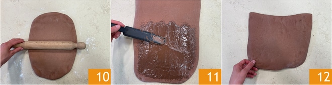 Sur une surface légèrement farinée, étalez la pâte avec un rouleau en lui donnant une forme aussi rectangulaire que possible 10, étalez la crème 11, repliez du côté long 12.