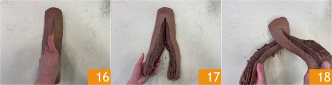 Une fois enroulé, incisez en partant de 3-4 cm d'une des deux extrémités du rouleau 16, coupez jusqu'à l'autre extrémité pour obtenir deux parties 17. Commencez à les tresser 18.