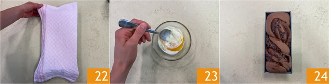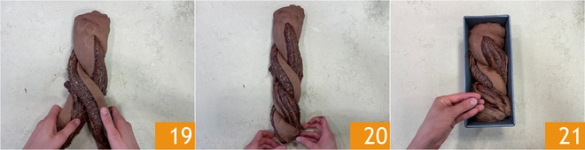 Continuez à créer le motif de tresse jusqu'à la fin 19 20. Placez la babka dans un moule haut de 8 cm, long de 26 cm et large de 11 cm. Ajoutez d'autres pépites de chocolat noir au goût même sur la surface 21.