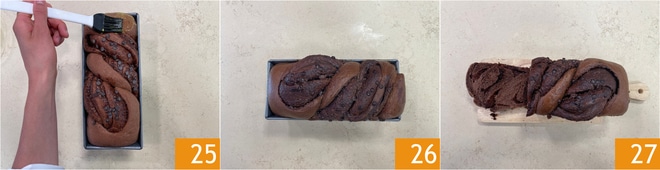 Vous pouvez la badigeonner avec le mélange de lait et d'œuf 25, puis enfourner à 180° pour 20-25 minutes. Une fois cuite, sortez-la du four 26, laissez refroidir puis démoulez et tranchez pour partager votre babka au chocolat 27.