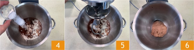 Enfin, versez le sel 4. Travaillez tout de suite avec le crochet à vitesse minimale au début 5, puis vous pouvez augmenter et travailler jusqu'à ce que la pâte devienne homogène et se détache des parois 6.