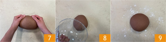 Sur le plan de travail, travaillez un peu la pâte et faites quelques plis 7, puis couvrez avec un bol et laissez reposer environ 10 minutes. Ensuite, répétez les plis pour que la pâte devienne plus lisse 9. Si elle n'est pas encore lisse, vous pouvez répéter l'opération de repos de 10 minutes sous le bol puis refaire des plis.