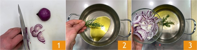 Pour préparer la morue confite sur crème de pois chiches, commencez par émincer finement les oignons 1. Dans une casserole, versez un filet d'huile, ajoutez le romarin 2, les oignons 3 et faites revenir pendant 2 minutes.