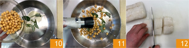Dans une poêle, versez un filet d'huile, ajoutez de la sauge, du romarin et des pois chiches 10. Assaisonnez de sel et de poivre 11. Faites sauter jusqu'à ce qu'ils soient croustillants. Coupez la morue en morceaux de même taille 12.