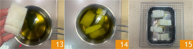Dans une casserole, versez l'huile, ajoutez le laurier et chauffez jusqu'à une température de 58°; munissez-vous d'un thermomètre pour la surveiller. Plongez la morue 13 et faites cuire pendant 10-12 minutes 14. Une fois ce temps écoulé, laissez égoutter la morue sur une grille 15.