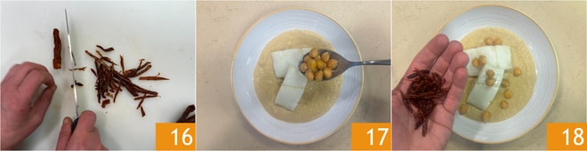 Coupez les tomates séchées en lamelles 16. Dressez le plat en mettant au fond de l'assiette de service la crème de pois chiches, déposez sur la surface deux morceaux de morue, ajoutez une cuillère de pois chiches croustillants 17 et les tomates séchées 18.