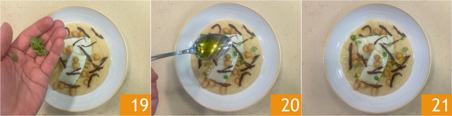 Complétez avec de la marjolaine fraîche 19 et une cuillère d'huile 20. La morue confite sur crème de pois chiches est prête à être dégustée 21.