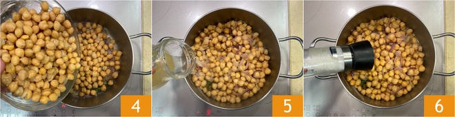 Ajoutez 520 g de pois chiches 4 et faites cuire pendant 10 minutes, ajoutez un peu de bouillon de légumes 5. Assaisonnez de sel 6.
