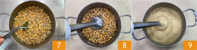Retirez le romarin 7 et mixez 8 avec un mixeur plongeant, en versant progressivement 60 g d'huile, jusqu'à obtenir une crème lisse 9.