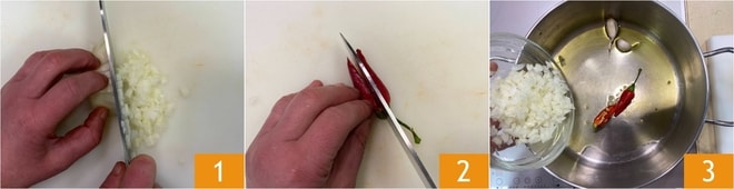 Pour préparer la morue en sauce avec des pommes de terre, commencez par éplucher l'oignon et le hacher finement 1, puis incisez le piment dans le sens de la longueur 2. Dans une casserole, faites revenir un filet d'huile avec le piment et les gousses d'ail écrasées, puis ajoutez l'oignon haché 3 et faites revenir pendant quelques minutes.