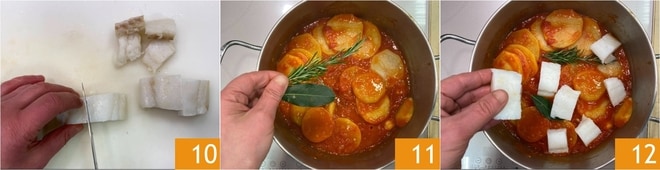 Entre-temps, coupez le filet de morue en morceaux 10, après avoir enlevé la peau et les éventuelles arêtes. Après 10 minutes, ajoutez le romarin et le laurier 11, puis placez les morceaux de morue à l'intérieur 12.