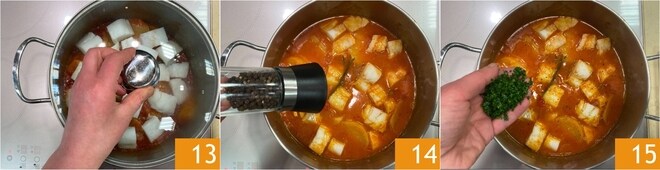 Couvrez et faites cuire pendant 10 minutes supplémentaires 13. En fin de cuisson, ajustez le sel et le poivre 14 et aromatisez avec le persil haché 15.