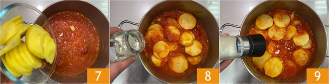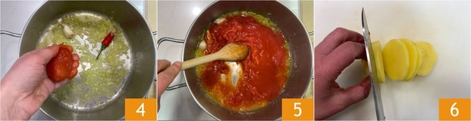 Quand l'oignon devient transparent, ajoutez les tomates pelées en les écrasant avec les mains 4 et faites cuire à feu doux pendant une dizaine de minutes 5. Pendant ce temps, épluchez les pommes de terre et coupez-les en tranches d'une épaisseur de 1 cm 6.