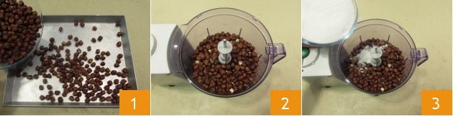 Pour préparer les baci di Alassio, versez les noisettes dans une plaque 1 et faites-les griller dans un four statique préchauffé à 180° pendant 8 à 10 minutes. Puis laissez-les tiédir et versez-les dans un mixeur 2. Ajoutez le sucre 3