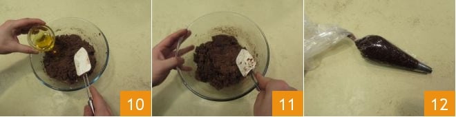 Ajoutez également le miel 10 et incorporez-le à la pâte, en continuant à mélanger délicatement avec la spatule 11. Transférez la pâte ainsi obtenue à l'intérieur d'une poche à douille munie d'une douille étoilée 12.