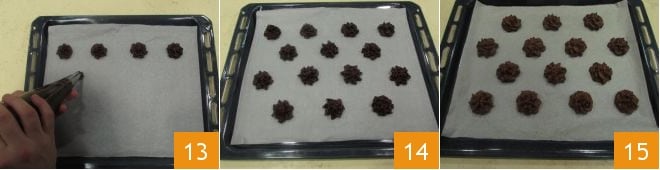 Exercez une légère pression avec les mains pour recréer des petits jets de pâte sur une plaque recouverte de papier sulfurisé (13-14), vous en obtiendrez environ 45-50 selon la taille que vous donnerez à chaque jet. Faites cuire vos biscuits dans un four statique préchauffé à 180° pendant 15-20 minutes (nous ne recommandons pas de cuire dans un four ventilé). Une fois sortis du four 15, laissez-les refroidir et, entre-temps, préparez la ganache.