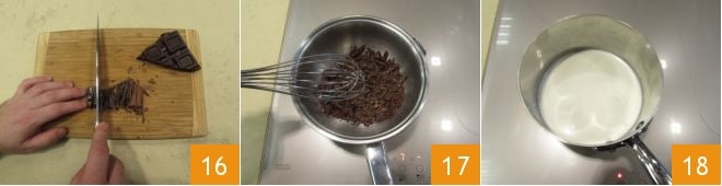 Hachez finement le chocolat 16, versez-le dans un saladier et commencez à le faire fondre au bain-marie, en mélangeant délicatement avec un fouet 17. Entre-temps, dans une petite casserole à part, chauffez la crème jusqu'à frôler l'ébullition 18