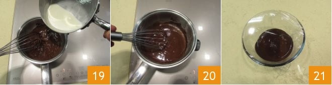 et versez-la directement dans le chocolat déjà fondu 19. Mélangez jusqu'à obtenir une ganache lisse et transférez-la dans un bol en la couvrant de film alimentaire 21 et laissez-la refroidir pendant 15-20 minutes à température ambiante.