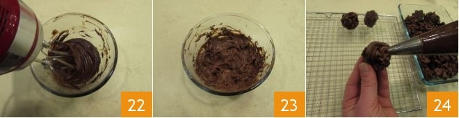 Seulement quand elle sera tiède, montez-la avec le batteur 22, jusqu'à ce qu'elle soit complètement refroidie. Une fois obtenue une crème dense et moelleuse 23, transférez-la à l'intérieur d'une poche à douille 24. Prenez l'un des petits biscuits et, en utilisant la poche à douille, pressez un jet de crème sur la partie plate 24.