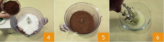 le cacao 4 et mixez le tout. Une fois obtenue une poudre la plus fine possible 5, transférez-la dans un grand bol ; à part, dans un autre bol, commencez à battre les blancs d'œufs avec un batteur 6