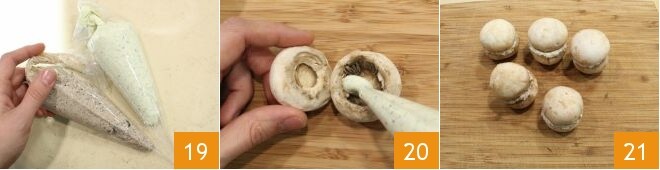 transférez les crèmes dans deux poches à douille 19 et remplissez les chapeaux en alternant les goûts des deux crèmes 20, associez les chapeaux deux par deux 21 comme si c'étaient les fameux "baci di dama", servez immédiatement vos baisers aux champignons !