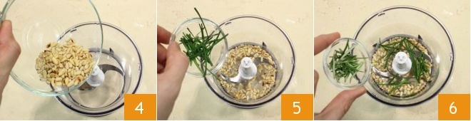 transférez-les dans le mixeur équipé de lames 4, ajoutez aussi les herbes aromatiques fraîches lavées et séchées : quelques brins de ciboulette 5, les aiguilles de romarin 6,