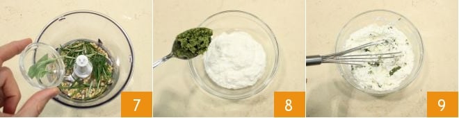 les feuilles de sauge 7, salez et poivrez avec le poivre blanc. Mixez le tout pour obtenir un mélange crémeux que vous ajouterez à l'une des deux crèmes de ricotta 8, mélangez avec un fouet pour amalgamer les ingrédients 9