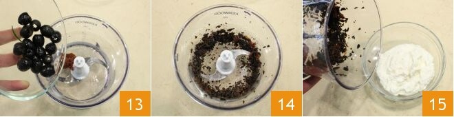 ajoutez également les olives noires dénoyautées 13 et mixez le tout pendant quelques instants 14, incorporez le hachis à la crème de ricotta restante 15, assaisonnez avec une pincée de poivre blanc et du sel, mélangez avec une cuillère pour amalgamer les ingrédients, couvrez avec du film alimentaire et laissez reposer au réfrigérateur pendant 30 minutes.