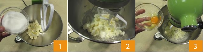 Pour préparer les baisers de dame aux noisettes, versez le beurre à température ambiante et préalablement coupé en dés dans le bol d'un batteur muni d'une feuille. Ajoutez ensuite le sucre en poudre 1, mettez en marche l'appareil à basse vitesse 2 et travaillez le tout pendant une dizaine de minutes. Une fois que vous avez obtenu une crème légèrement montée, ajoutez l'œuf 3 et laissez-le s'incorporer complètement.