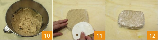Seulement lorsque vous obtenez un mélange homogène 10, transférez-le sur un plan légèrement fariné et travaillez-le avec les mains ou avec une raclette, pour ne pas trop le chauffer, jusqu'à lui donner la forme d'un pâton 11. Enveloppez-le dans du film plastique 12 et placez-le au réfrigérateur pour le raffermir pendant au moins 1 heure.