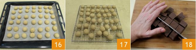 Une fois sorties du four 16, transférez les boules sur une grille 17 et laissez-les refroidir complètement. Pendant ce temps, préparez la garniture : prenez le chocolat gianduia et coupez-le en dés 18,