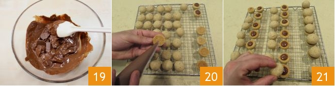 puis faites-le fondre 19 au bain-marie ou au micro-ondes en l'activant 30 secondes à la fois et en remuant le chocolat avant de le chauffer à nouveau. Une fois fondu, laissez-le tiédir, en remuant de temps en temps, jusqu'à obtenir une consistance assez dense. Transférez le chocolat dans une poche à douille et étalez-en un peu sur la face plate d'une boule, puis refermez avec une autre boule. Complétez les baisers de dame aux noisettes de cette manière et laissez-les reposer environ 20 minutes sur une grille : lorsque le chocolat gianduia aura séché, les petits biscuits resteront unis et seront prêts à être dégustés !